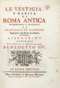 Ficoroni Francesco (de), Le Vestigia, e rarità di Roma antica ricercate... Libro primo (-secondo). In Roma: nella stamperia di Girolamo Mainardi, 1744.