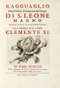 Sergardi Lodovico, Ragguaglio della solenne traslazione del corpo di s. Leone Magno [...] nella Basilica Vaticana... In Roma: nella Stamperia di Gio. Maria Salvioni, 1715.