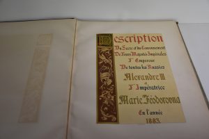RARE : DESCRIPTION DU COURONNEMENT DE LEURS MAJESTES IMPERIALES L'EMPEREUR DE TOUTE LES RUSSIES ALEXANDRE III ET DE L'IMPERATRICE MARIA FEODOROVNA EN 1883. EDITE à SAINT PETERSBOURG en 1883, texte en Français en noir, bleu et rouge sur deux...