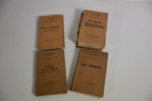 E.J. GILBERT, les livres du mycologue, 4 T. La spore des champignons 1927, la mycologie sur les terrains, 1928 les bolets 1931, méthode de mycologie descriptive 1934. DOS DU TOME 4 ABIME.
