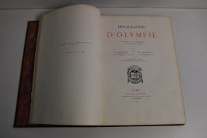 RESTAURATION D'OLYMPIE par VICTOR LALOUX, PAUL MONCEAUX (l'histoire, les monuments, le culte et les fêtes), PARIS, QUENTIN 1889. Nombreuses illustrations. In folio, 366/500, 228 p. DEMI MAROQUIN, TITRE OR. COIFFE DE QUEUE ARRASEE. EX LIBRIS MARTINON.