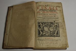 MONTAIGNE, LES ESSAIS, PARIS chez ANGUSTIN COURBE 1652. Impression H. ESTIENNE. Vignette de DARET sur la page de titre, le frontispice portrait de MONTAIGNE est placé derrière la page de titre. Comprend l'épistre de Melle DE GOURNAY. In folio, iv,...