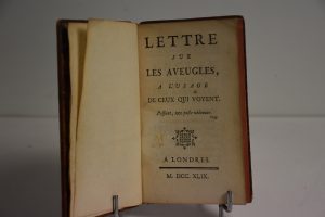 DIDEROT, LETTRE SUR LES AVEUGLES A L'USAGE DE CEUX QUI VOIENT, sn., LONDRES 1749. In 12, 221 p, 6 pl. Plein veau, titre sur pièce, dos orné. Mors fragiles. 2 édit à l'année de l'original. TEXTE QUI FIT SCANDALE ET VALU A DIDEROT D'ETRE...