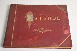 LIBRAIRIE GODFURNEAU, ALBUM PHOTOS OSTEND, folio oblong, demi chag à coins, plats toile avec titre, tranche or. 18 PHOTOS EN NOIR et BLANC SUR 24 (28x 20,5), LEGENDE SOUS CHAQUE PHOTOS, LE PHARE ET LA DIGUE DE MER, LA DIGUE DE MER ET LE KURSAAL, la...