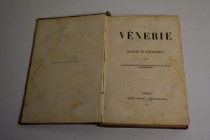 LA VENERIE de JACQUES DU FOUILLOUX, ANGERS, CH.LEBOSSE 1844. Nombreuses gravures sur bois. In 8°, 125 p, demi veau, titre or. Accroc sur le dos.
