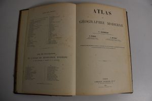 ATLAS de GEOGRAPHIE MODERNE par F.SCHRADER, F.PRUDENT, E.ANTHOINE, PARIS, HACHETTE 1892. 64 cartes imprimées en couleurs et environ 600 cartes de détail. In folio monté sur onglets, reliure éditeur en demi bas à coins, titre sur plat et dos....