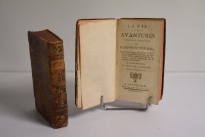 LA VIE et les AVENTURES surprenantes de ROBINSON CRUSOE, le tout écrit par lui même, traduit de l'Anglais à AMSTERDAM chez l'HONORE & CHATELAIN 1749. 2 vol in 12, vj, 486, 456 p. Plein veau moucheté, titre sur pièce, dos orné. Reliure usée,...
