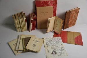 1956, le sable du sablier 1945. 2 vol bradel demi toile soie, titre sur pièce. 6 VOL RELIES AVEC DEDICACE A G. MICHAU. ADELINE, la belle ignorée 1944, lueurs de France 1943. J. AUBERT, poèmes choisis 1961. G. CATTAUI, la terre visitée 1945. LUDOVIC DE GAIGNERON, le secret de l'être 1955. 5 vol broches et dédicacés à G. MICHAU. JOINT : J. COCTEAU, LA VOIX HUMAINE, 1930 édit orginale, les enfants terribles 1951, RENAUD et ARMIDE 1943. LOUISE DE VILMORIN, madame de 1951. J. MOREAS, poèmes et sylves ,sd. J. DE BUSCA à contre-jour 1938. 2 vol demi parchemin, 4 demi toile soie. ENSEMBLE ACCOMPAGNE D'UNE LETTRE DATEE ET SIGNEE 1952, MUSIDORA, AVEC UN JOLI DESSIN. ELLE FELICITE GEORGE MICHAU POUR SON TRAVAIL. MUSIDORA 1889-1957, actrice, les vampires, JUDEX. + 4 ouvrages divers.