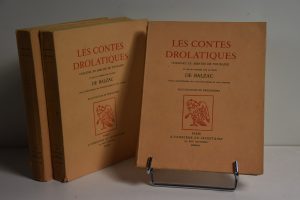 H. DE BALZAC, LES CONTES DROLATIQUES, PARIS, à l'emblème du secrétaire 1941. Illustrations de DESLIGNERES. 3 vol in 8° brochés, 323/600 sur vélin, frontispice pour chaque vol, 195, 206, 176 p, couv rempliée.