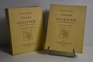 JONATHAN SWIFT, VOYAGE de GULLIVER dans des contrées lointaines, PARIS, à l'emblème du secrétaire 1940. Illustrations de TIMAR. 2 vol in 8° brochés, frontispice au deux vol, 253, 240 p, 726/900 sur vélin.