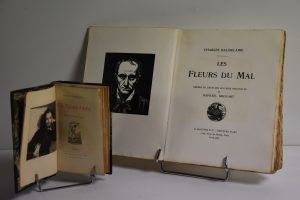 CHARLES BAUDELAIRE, LES FLEURS DU MAL, PARIS, G. BOUTITIE 1923. Frontispice et illustrations de RAPHAEL DROUART. In 8° broché, 298 p, un des mille sur vélin. JOINT :CH. BAUDELAIRE, les fleurs du mal, PARIS, ALPHONSE LEMERRE 1888. Demi chag à...