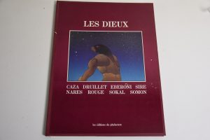 LES DIEUX, 8 planches signées et numérotées par les auteurs, CAZA, SOKAL, SIRE, EBERONI, SOMON, DRUILLET, ROUGE, NARES, éditions du PHYLACTERE 1983. Chemise à rabats et titre.