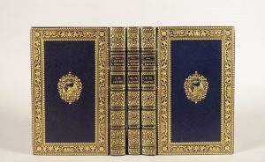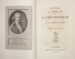 DEMOUSTIER Charles-Albert. Lettres à Émilie sur la mythologie. Paris, Ant. -Aug. Renouard, 1809 ; 6 parties à pagination séparée en 3 vol. in-8, reliures de l'époque maroquin à long grain bleu nuit, les plats ornés d'une large dentelle florale dorée en encadrement avec cygnes affrontés, emblème central, dos à nerfs ornés de motifs dorés, dentelle intérieure et tranches dorées (Canape).