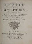 BOUGAINVILLE Louis-Antoine de. Traité du calcul intégral, pour servir de suite à l'Analyse des infiniment-petits de M. le marquis de l'Hôpital. Paris, H.l. Guérin & L.F. Delatour, 1754-1756, 2 vol. in-4, reliures de l'époque veau marbré, dos à nerfs ornés de motifs dorés, petite usure aux angles, petite fente à un mors.
