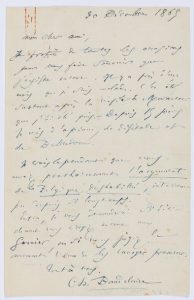 BAUDELAIRE Charles. Lettre autographe signée « Ch. Baudelaire » à Julien Lemer. [Bruxelles], 30 décembre 1865 ; une page in-8 à l'encre bleue sur un bifeuillet.