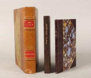 GIDE André. Dostoïevsky d'après sa correspondance. Paris, Eugène Figuière et Cie, 1911 ; in-12, reliure ancienne demi-maroquin violine à coins, filets dorés, dos à nerfs, tête dorée, couverture, étui-boîte à dos de maroquin (P. L. Martin).