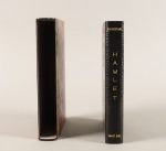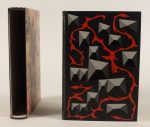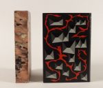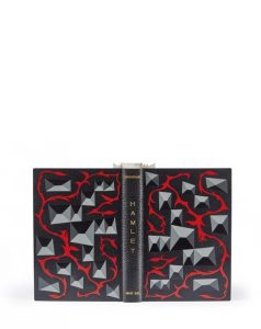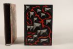 GIDE André. William SHAKESPEARE. Hamlet. Édition bilingue. Traduction nouvelle par André Gide. New York, Jacques Schiffrin, Pantheon Books, 1945 ; in-8, reliure ancienne maroquin noir, les plats mosaïqués de motifs géométriques gris et noirs parcourus de bandes rouges figurant des éclairs, dos lisse, tête dorée, couverture et dos, étui (Devauchelle).