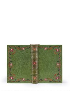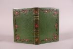 HUYSMANS Joris-Karl. À Rebours. Paris, F. Ferroud, 1920 ; grand in-8, reliure de l'époque maroquin vert pré, grands motifs floraux art nouveau mosaïqués sur les plats et le dos à nerfs, doublures de maroquin beige ornées de motifs mosaïqués, tranches dorées, couverture et dos, étui (Esther Founès).
