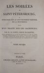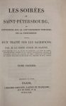 MAISTRE Comte Joseph de. Les Soirées de Saint-Pétersbourg ou Entretiens sur le gouvernement temporel de la Providence suivi d'un Traité sur les sacrifices, Paris, Librairie Grecque, Latine et Française, 1821, 2 vol. in-8, reliures de l'époque demi-basane marbrée, dos lisse avec pièces rouge et noire (M. Comynet, imprimeur-libraire et relieur à Avallon).