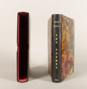 MALLARMÉ Stéphane. - Edgar POE. Les Poèmes d'Edgar Poe. Traduction de Stéphane Mallarmé. Avec portrait et fleuron par Édouard Manet, Bruxelles, Edmond Deman, 1888, grand in-8, reliure maroquin noir, dessin d'après Manet doré sur chaque plat, dos lisse, chemise et étui (Bérangère Polack).
