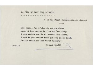 1972. (CARTA-POESIA). CARTA DE OCTAVI SALROS A MERCE SANPONS EN LA QUE LE DEDICA LA POESIA LA FIRA DE SANT PONÇ DE 1972. Octavi Saltor i Soler (Barcelona 1902 - 1982) fué un escritor y politico catalan, licenciado en letras y en derecho.
