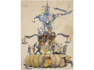 1950 ca. (VALENCIA). VILLALBA, J.: AQUELARRE VALENCIA. Dibujo original sobre las fallas de Valencia, 64x48 cm.