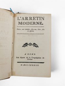 [DU LAURENS] : L’Arretin moderne. Rome, Aux dépens de la Congrégation de l’Index (Paris), 1783 Deux vol. in 12, demi basane blonde ornée, coins de vélin. Reliure de l’époque. (reliure usagée).
