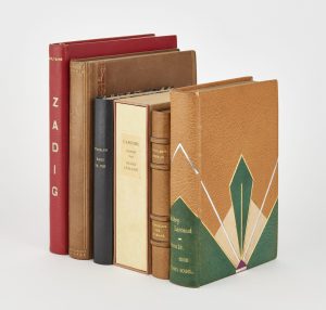Ensemble de six volumes illustrés: - LARBAUD: Beauté, Aime Mon Beau Soucis. 1920, Ill. de LABOUREUR, Rel. De Bernard. - VOLTAIRE: Zadig. Ill. de R. Mauge. Chamonix, 1947. Mar. rouge - SAMAIN: Aux Flancs du Vase. Ill. de Marcelle Picard. Reliure en...