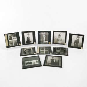 Dix photographies de femmes en robes élégantes, XIXe s Assiettes en verre 8x8 cm
