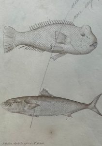 [ARAGO (Jacques). d'après]. – OUDART (Paul-Louis). Dessin original de poissons. Encre grise et …