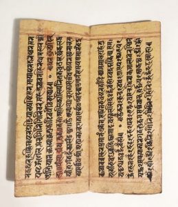 MANUSCRIT NÉPALAIS. Encre et pigments polychromes sur papier. Népal, XIXe siècle. Hauteur Page : 7,6 cm ; Largeur Page : 18,5 cm. Comporte 8 peintures en vignettes polychromes.