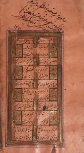 MANUSCRIT PERSAN. Diwan de Hafiz. Encre, pigments polychromes et or sur papier coloré. Iran, XVIe siècle (reliure postérieure). Hauteur : 15,9 cm ; Largeur 9,4 cm ; Profondeur : 2,5 cm. Manuscrit persan acéphale du Diwan de Hafiz en écriture nasta’liq répartie sur 14 lignes par page, sur papier de couleur, comportant de nombreux cartouches enluminés à décor floral sur fond or sur les lignes de texte, et filets d’encadrements dorés sur chaque page, et notes marginales diverses.
