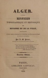 PERROT (Aristide-Michel). Alger. Esquisse topographique et historique du royaume et de la ville. Paris, Ladvocat, 1830. 95 pp. Deuxième édition, parue l’année de l’originale, avec une carte générale du royaume et un plan de la ville et du port d’Alger gravés par Pierre Tardieu.