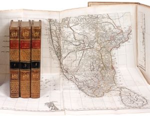 Rennell (James). Description historique et géographique de l’Indostan. – Recueil de cartes géographiques. Paris, Poignée, 1800. 3 volumes in-8 et un atlas in-4, le texte en veau raciné, dos lisse orné, tranches mouchetées, l'atlas en demi-veau marbré, dos lisse orné de même, tranches mouchetées (Reliures de l'époque). Première édition française, traduite par Jean-Baptiste Boucheseiche sur la septième édition anglaise. L'éditeur y a joint des Mélanges d'histoire et de statistique sur l'Inde traduits par Jean Castéra.