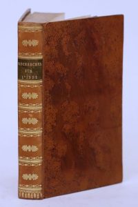 ROBERTSON (William). Recherches historiques sur l’Inde ancienne, sur la connoissance que les anciens en avoient, et sur les progrès du commerce avec cette contrée avant la découverte du passage par le cap de Bonne-Espérance. Paris, Janet et Cotelle, 1821. In-8, basane racinée, dos lisse orné, tranches marbrées (Reliure de l'époque). Nouvelle édition, revue et corrigée, illustrée de 2 cartes dépliantes gravées par Ambroise Tardieu.