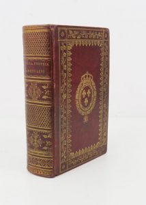 In-8 de [2] ff.-537 pp.-[1] f. Maroquin long grain grenat, dos lisse richement orné, titre doré, bel encadrement de double filet, guirlandes de pampre et de fleurs de lys dorés, armes dorées au centre des plats, roulette dorée sur les coupes et les chasses, tr. dorées (reliure de l'époque, signée de P. Lesné).