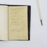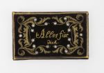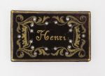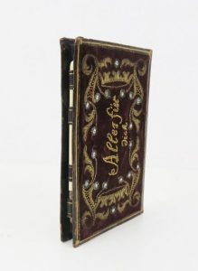 Carnet brodé. Carnet relié en maroquin brun, plats doublé de velours brodé de fil doré et paillettes, mention "Alles für dich" au premier plat et prénom "Henri" brodés en petites perles dorées, gardes de tabis violine, avec son porte mine en ivoire et métal argenté. Premiers et derniers feuillets couverts de notes manuscrites en allemand à la mine de plomb et à l'encre, avec une date de 1858 indiquée. Manque en coiffe sup. Très bel exemplaire bien conservé.