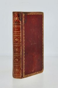 In-12 maroquin rouge, dos lisse richement orné, large bordure dorée encadrant les plats, filet doré sur les coupes, roulette intérieure, tranches dorées (reliure de l’époque).