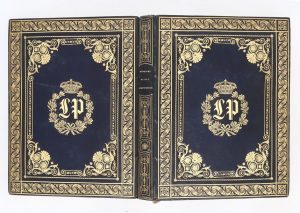 In-4 maroquin long grain noir, dos lisse finement orné, titre doré, plats richement orné d'un encadrement doré élaboré et des initiales LP couronnées et laurées, coupes filetées, dentelle intérieure, gardes de moire rose (reliure de l'époque). Portrait gravé en frontispice. Ex-libris de William Sandilands of Barny Hill.