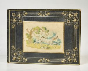 In-8 oblong de 39 ff. de papier vélin blanc, ocre ou grège, vierge ou bien amputé de son contenu (traces de ff. arrachés). Relié en chagrin vert, filets et fleurons rocaille dorés en encadrement, pièce de broderie (sujet cynégétique) montée au centre du premier plat, cartouche à froid au centre du second plat, dos orné, dentelle int., tr. dorées (reliure de l'époque).