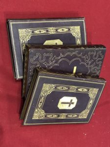 2 vol. grand in-8 chagrin brun, dos lisse finement orné, titre et tomaison dorés, double filet doré et décor à la cathédrale encadrant les plats avec croix en relief sur fond doré au centre, tr. dorées, décor doré encadrant les contreplats, gardes de tabis ivoire (Bonfils).