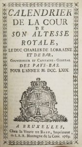 Calendrier de la Cour. de Son Altesse Royale, le Duc Charles de Lorraine et de Bar, Gouverneur et Capitaine-Général des Pays-Bas. Pour l'année M.DCC.LXIX. Bruxelles, Veuve de Bast, 1769.