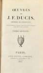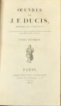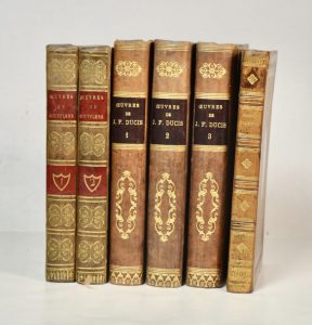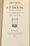 - DUCIS (J.F.), Œuvres. Paris, Nepveu, 1813. 3 vol. in-8 demi-veau havane, dos lisses ornés de fers rocaille dorés, p. de titre en mar. brun (rel. 2e moitié XIXe s.). Portrait en front. et 5 figures hors texte (+ 2 planches de musique gravée).