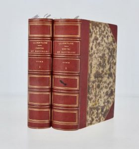 Nouvelle édition revue et corrigée d’après les manuscrits et les éditions originales avec toutes les variantes et plusieurs contes inédits accompagnée de notes et précédées de l’histoire de la vie et des ouvrages de La Fontaine. (Vicaire I, 671.) Elle est truffée du portrait de La Fontaine sur chine appliqué et de 88 planches hors-texte dont 79 sur chine appliqué par divers artistes gravées par Leroux, Simonet, Diligon, Pouget, etc. et 9 figures 18e non signées. Certaines figures sont très libertines.