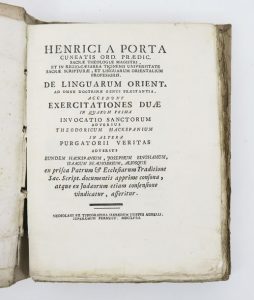PORTA (Henrici). De linguarum orient. Ad omne doctrinae genus praestantia accedunt exercitationes duae in quarum prima invocatio sanctorum adversus Th. Hackspanium in altera purgatorii veritas adversus eundem Hackspanium, J. Binghamum, I. Beausobrium. Mediolani. (Saintes), Agnelli, 1758.