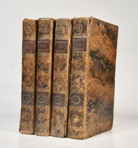 4 vol. in-8 veau porphyre, dos lisses ornés, pièces de titre et de tomaison en mar. (reliure de l'époque). Coiffes, mors et coins usés.