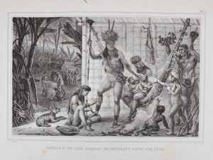 Cousin et élève de David, le peintre Jean-Baptiste Debret (1768-1848), accepta, à la chute de l'Empire, la proposition du roi du Portugal Jean VI, en exil au Brésil, d'y rejoindre la cour et de participer à la création d'une Académie des Beaux-Arts à Rio de Janeiro. Il y séjournera près de 16 ans, durant lesquels le pays passa de colonie portugaise à empire autonome (proclamé à Sao Paulo le 7 septembre 1822). Outre la chaire de peinture d'histoire de l'Académie des Beaux-Arts, Debret obtint le poste de peintre officiel de la famille impérial et de la cour de Pierre Ier (qu'il conseilla entre autres pour la conception du premier drapeau jaune et vert du Brésil). Profitant d'un congé de 3 ans accordé par l'empereur, Debret rentra définitivement en France en 1831 où il s'attela immédiatement à la publication de son Voyage pittoresque et historique au Brésil, présenté en 26 livraisons (réunies en 3 volumes) entre 1834 et 1839. La publication ne rencontra pas à sa sortie le succès escompté, peut-être en raison de son tarif élevé, et une partie du tirage finit en chutes de papier. Debret connut en revanche un grand regain d'intérêt à titre posthume dans les années 1930 au Brésil (une rue du centre de Rio porte son nom depuis) et les exemplaires de son Voyage atteignirent alors des prix très élevés, au regard de leur rareté (sans compter que les relations de voyage au Brésil illustrées de cette sorte sont très peu courantes).