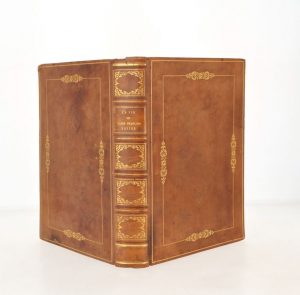 In-4, veau blond XIXème, dos à nerfs richement orné, large motif doré encadrant les plats avec large estampe à froid en leur centre, roulette dorée sur les coupes.