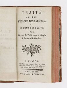 [GAUTHIER (François-Louis, Abbé)]. Traité contre l'amour des parures, et le luxe des habits ; par l'Auteur du Traité contre les danses & les mauvaises chansons. Paris, Lottin, 1779.
