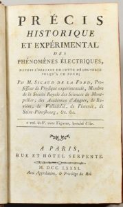 SIGAUD DE LA FOND (Jean-René). Précis historique et expérimental des phénomènes électriques… Paris, Rue et Hôtel Serpente, 1781.